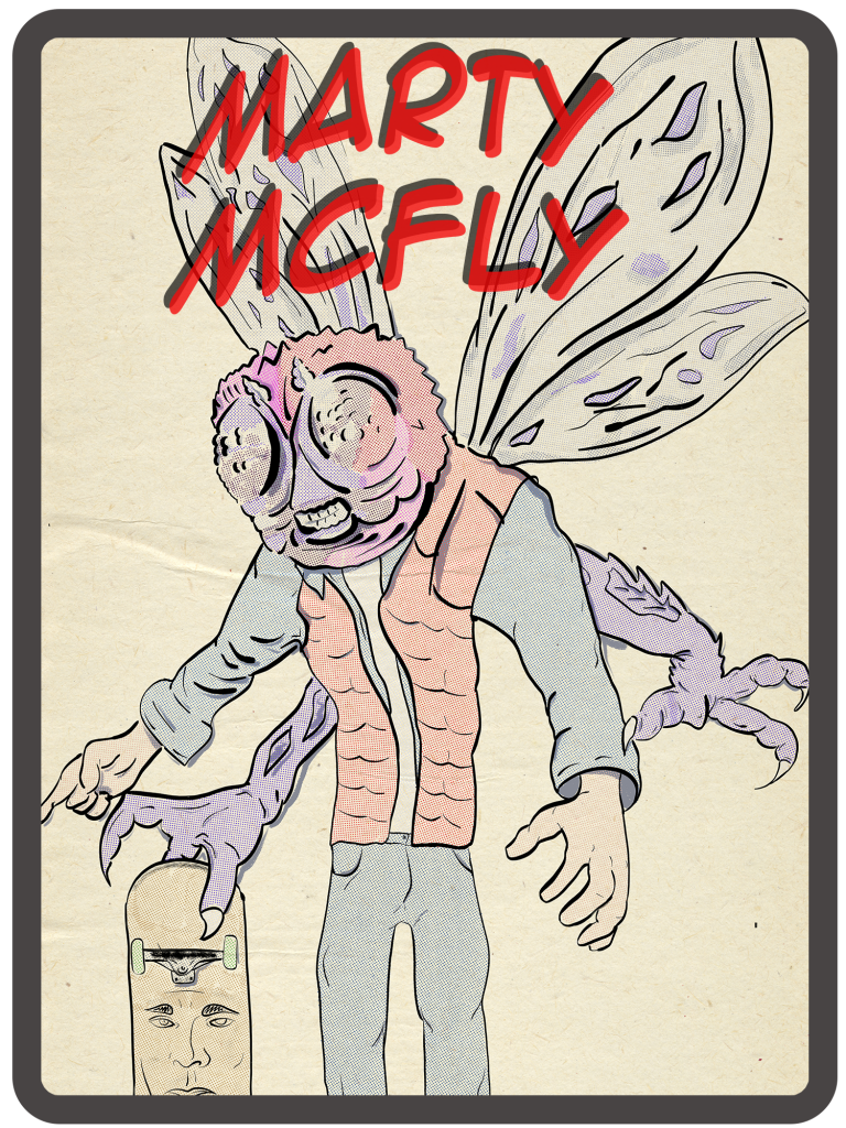 I have recently been particularly inspired by some folks that I find to be incredibly talented – notably Mash -up master “Butcher Billy“, prolific skate and multidisciplinary artist Tim Baron, as well as comic style artist Felipe Flores, and Super7, the company that makes all of the great stuff from our youth. I wanted to make an homage to my youth. I *loved* the “Back to the Future” movie. Fourth grade me had the jean jacket and a puffy vest. I got my first skateboard – an event that would later shape my entire life – based on that movie. I also loved Teenage Mutant Ninja Turtles. As very young teenagers, that movie was a first date for my eventual wife and myself. So, with some Procreate and Photoshop work, a lot of reference material, and a load of how-to videos on technique…here is my “Marty McFly” trading card.